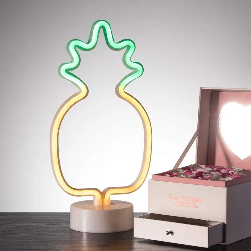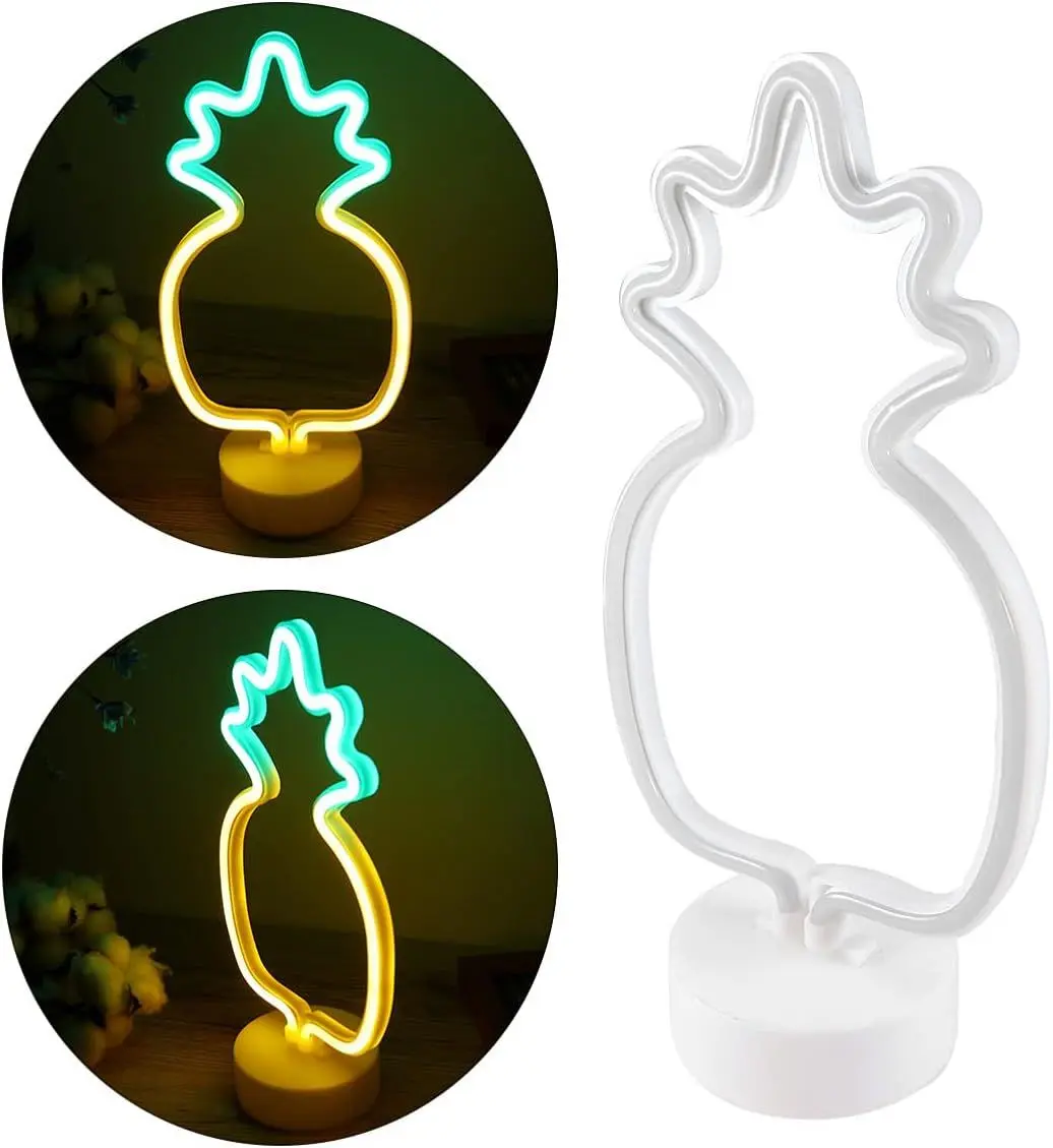 Lampara led de mesa. Diseño de ananá.Color amarillo y verde.Funciona con 3 pilas AA. No incluye las pilas.Medidas aproximadas: 26cm